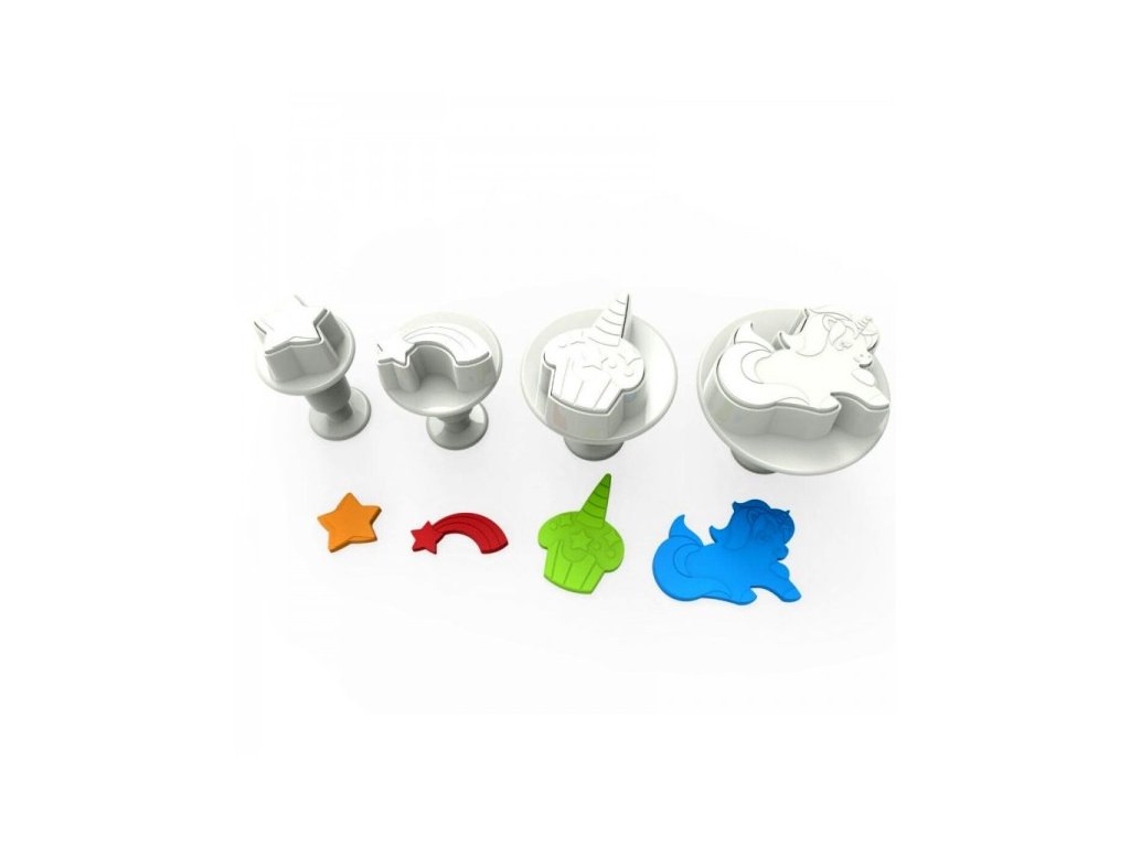 Sada 4 plastových pístových vypichovátek, různé velikosti. Snadná výroba korunek 3 krocích. Vykrojit, vymáčknout a pomocí pístu vytlačíme hotové tvary