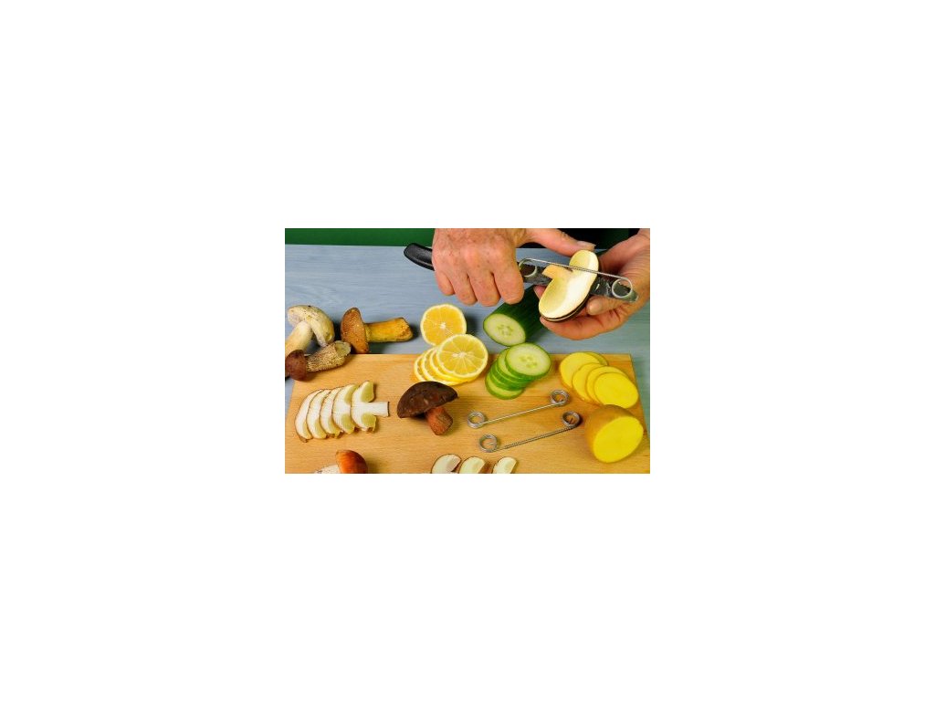 1) Použijeme běžný kuchyňský nůž (ostrý), který vsuneme do prvních oček a dostaneme tak jemný plátek, který využijeme při oloupání jablek, brambor i mrkve. Takto naplátkujeme i sýr na jemné plátky.