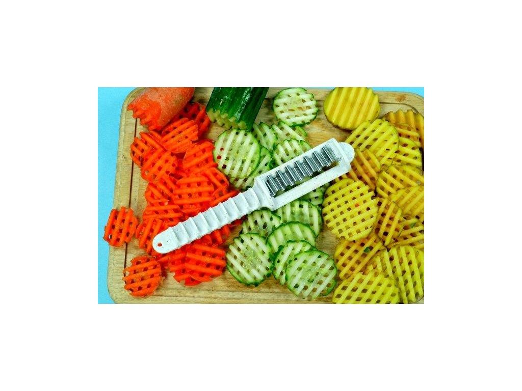 Tvarové mřížky vytvoříme odkrajováním jednotlivých vrstev z očištěných brambor, okurky, mrkve, ředkve, větších ředkviček i sýra, přičemž mezi každým řezem postupně pootáčíme o 90°.