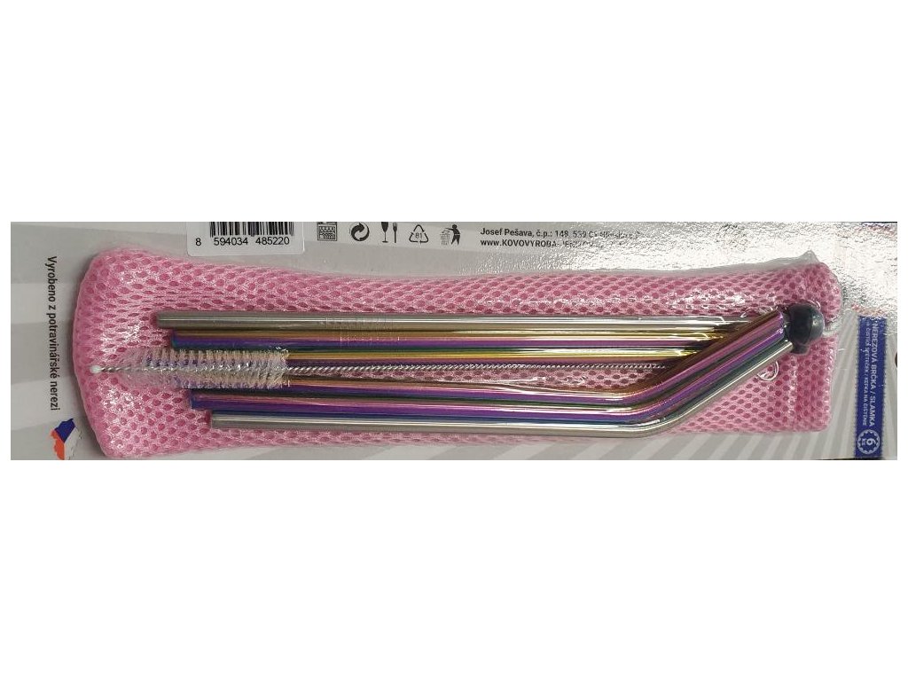 Sada nerezových brček. V sadě se nacházejí 2 rovná + 2 zahnutá nerezová – DUHOVÁ, 1 rovné a 1 zahnuté nerezové STŘÍBRNÉ brčko, čistící štěteček a RŮŽOVÝ sáček pro jejich pohodlné uskladnění.