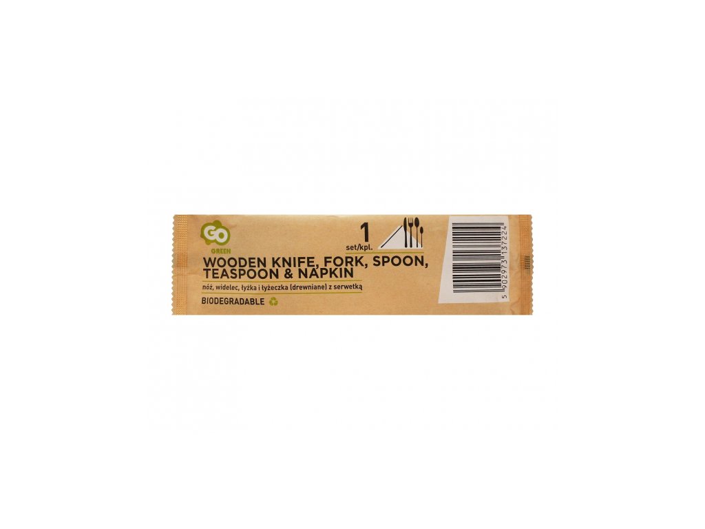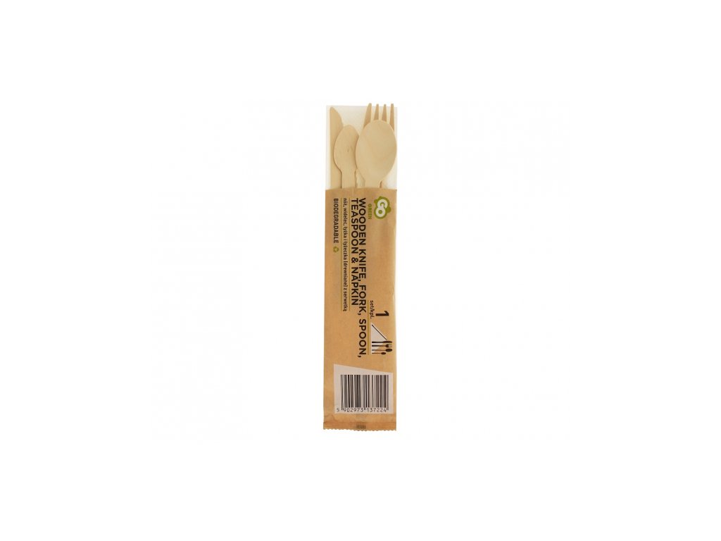 Dřevěné jednorázové příbory, sada + ubrousek - 1 ks
